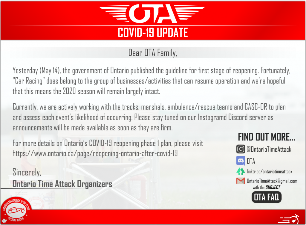 Yesterday (May 14), the government of Ontario published the guideline for first stage of reopening. Fortunately, “Car Racing” does belong to the group of businesses/activities that can resume operation and we’re hopeful that this means the 2020 season will remain largely intact.